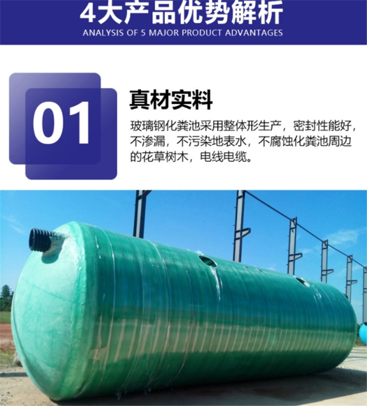 2、密封性好,不滲漏,徹底防止傳統(tǒng)化糞池地下水滲漏所產(chǎn)生的污染。同時改善地基濕軟下沉對建筑的危害,具有較好的環(huán)保效益。