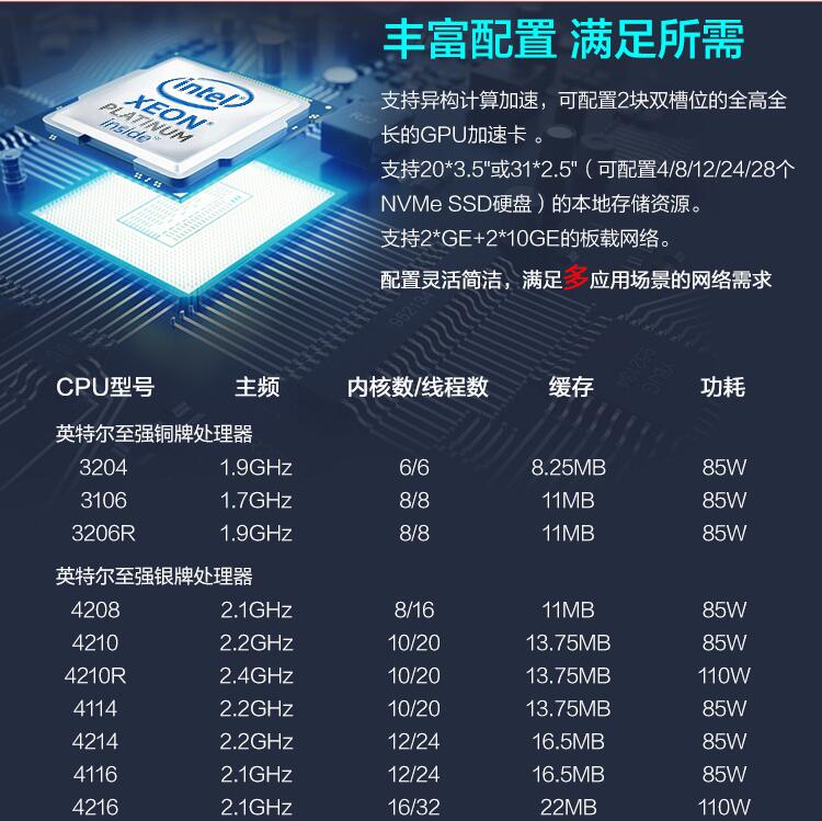 | 處理器 | 1/2個(gè)代英特爾®至強(qiáng)®可擴(kuò)展處理3100/4100/5100/6100/8100系列,205W 1/2個(gè)代英特爾®至強(qiáng)®可擴(kuò)展處理3200/4200/5200/6200/8200系列,205W |